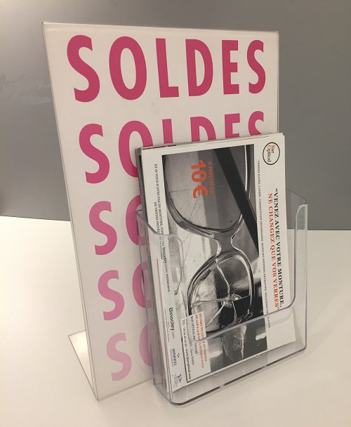 - Format du porte visuel A3 (297x420 mm) + distributeur A6 (105x150 mm) ou A5 (150x210 mm) ou A4 (210x297 mm).
